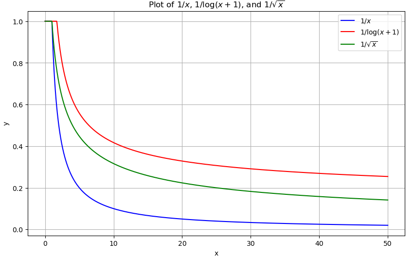 연구 내용중 핵심 기능 중 하나가 adaptiveness 인데, 모델 학습시 브레이크 역할을 해줘야하는 damper 함수로 sqrt를 쓰다가 log를 한번 써볼까 싶어 간단히 테스트를 해보니 1/x은 너무 공격적이라 값이 조금만 올라가도 확 줄어 들어 버리고, 1/log는 또 너무 느리게 감소해서 100이 넘어도 많이 깎여 나가지 않는 문제가 있어서 결국 그냥 sqrt가 가장 무난하고, gradient 값의 범주내에서는 적당한 damping 효과를 주는것으로 보여서 결국 다시 지난주 초에 설정한 알고리즘으로 다시 돌아갔다.